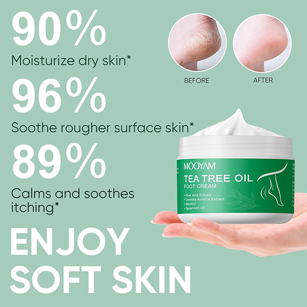 MOOYAM Tea Tree Oil Foot Cream is a moisturizing cream formulated with tea tree oil and aloe vera, designed to hydrate and nourish dry, cracked feet. It also helps alleviate itching and inflammation, promoting overall foot health. Suitable for daily us