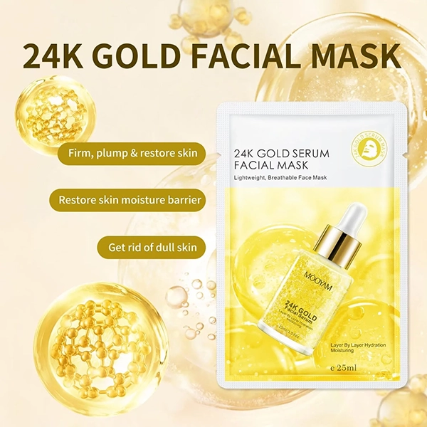 A luxurious facial mask infused with 24K gold and hyaluronic acid, designed to hydrate, firm, and brighten the skin. Helps reduce the appearance of fine lines and wrinkles, promoting a youthful and radiant complexion. Suitable for all skin types.