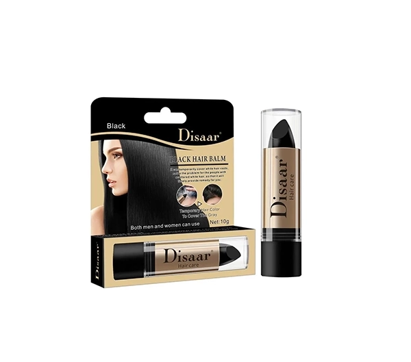 A temporary hair balm designed to cover white or gray hair instantly. Features a lipstick-style applicator for easy use, providing natural-looking black color without stickiness. Washes out easily with water.