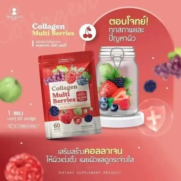 Precious Skin Thailand's Collagen Multi Berries supplement combines collagen with extracts from strawberries, cherries, raspberries, and blueberries to support skin health, hair vitality, and joint function.