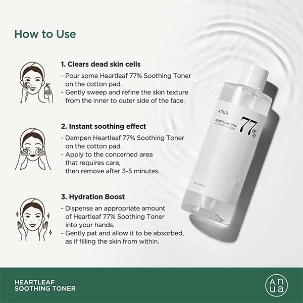 A refreshing soothing toner formulated with Heartleaf extract to calm irritation, refine pores, and hydrate skin for a clear and balanced complexion.