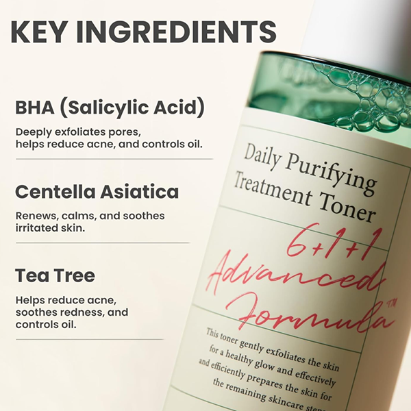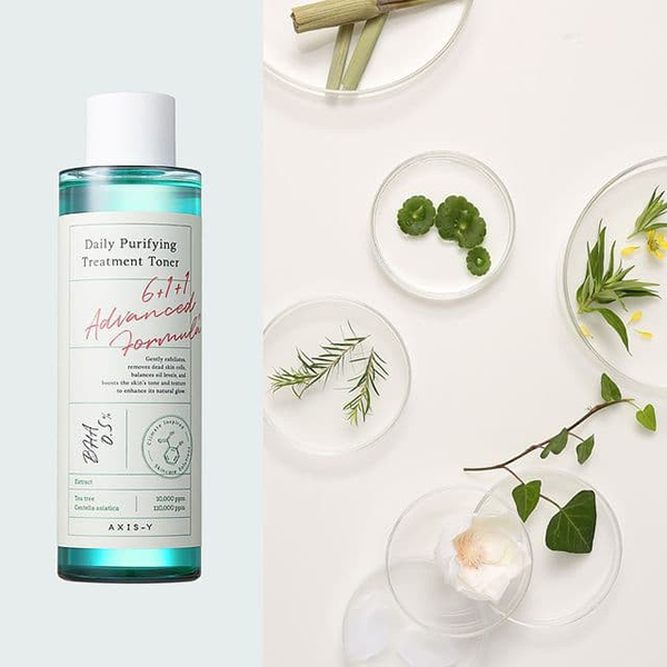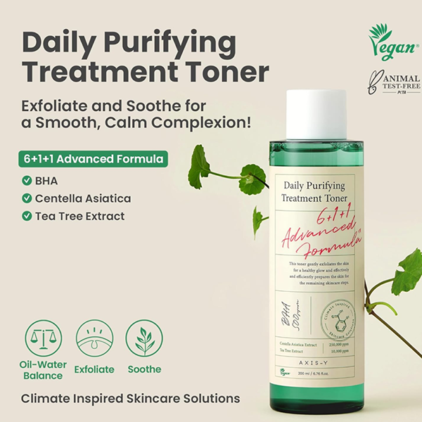 AXIS-Y Daily Purifying Treatment Toner is a gentle exfoliating toner formulated with 0.5% salicylic acid, centella asiatica extract, and tea tree extract. It effectively removes impurities, controls sebum production, and soothes irritated skin, promoting a clearer and healthier complexion.