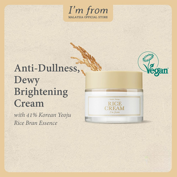 I’m From Vegan Korea Rice Cream is a nourishing facial cream formulated with rice extract to help brighten skin tone, strengthen the skin barrier, and provide long-lasting hydration. Its rich yet lightweight texture absorbs smoothly, leaving the skin soft, balanced, and naturally radiant. S...