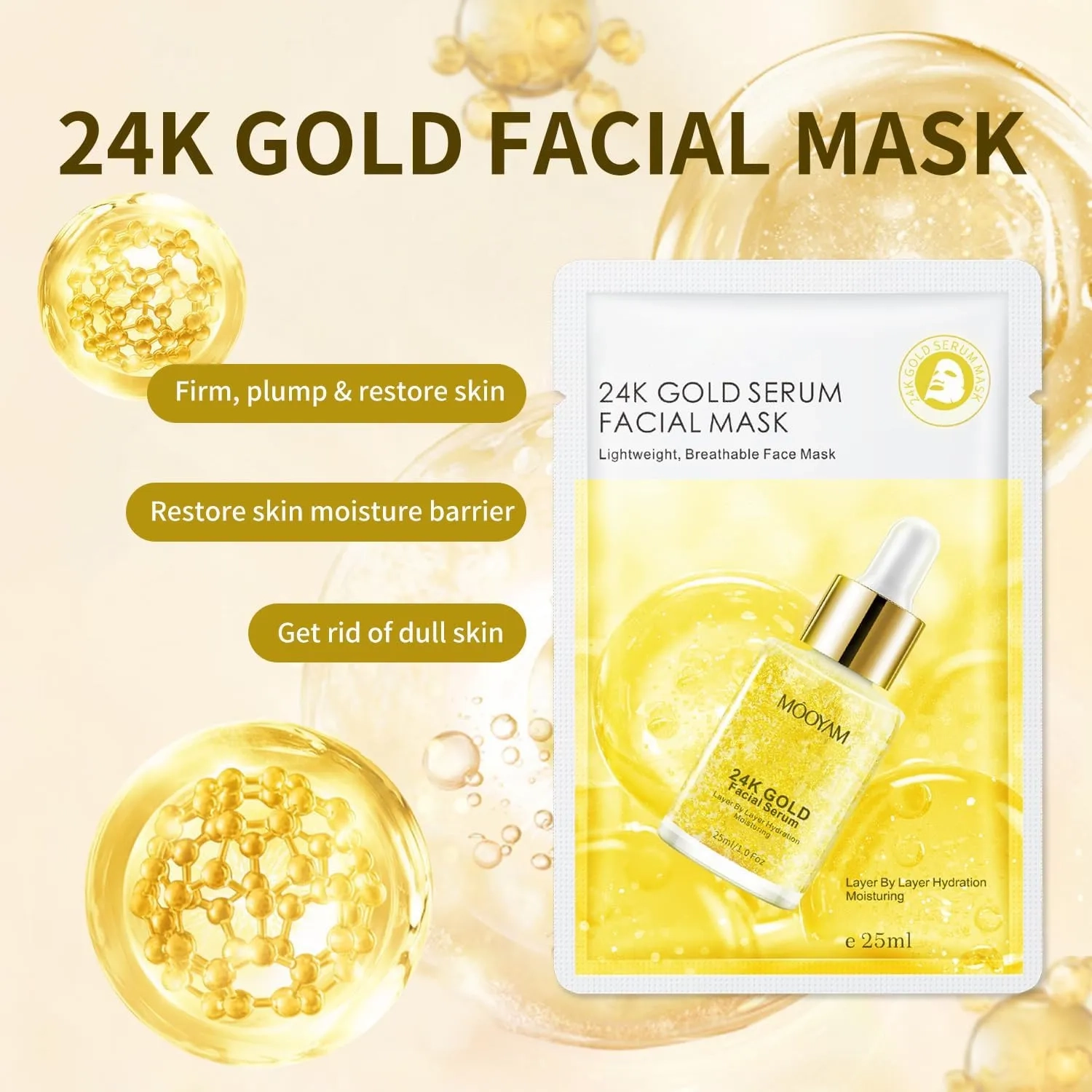 A luxurious facial mask infused with 24K gold and hyaluronic acid, designed to hydrate, firm, and brighten the skin. Helps reduce the appearance of fine lines and wrinkles, promoting a youthful and radiant complexion. Suitable for all skin types.