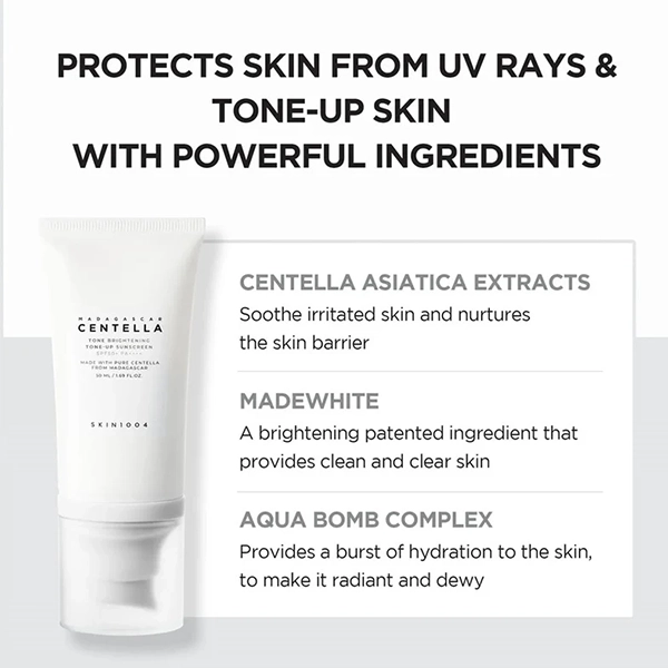 A multifunctional tone-up sunscreen that provides high broad-spectrum protection while enhancing skin brightness and tone. Enriched with Centella Asiatica extract, it helps soothe the skin, reduce redness, and improve overall clarity. The lightweight formula delivers a natural tone-up effect, ins...