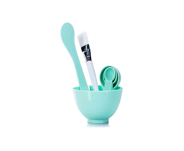 Portable 4‑in‑1 mask tool set: mixing bowl, spatula, silicone brush, and measuring spoons—lightweight, travel‑friendly, and hygienic for DIY masks